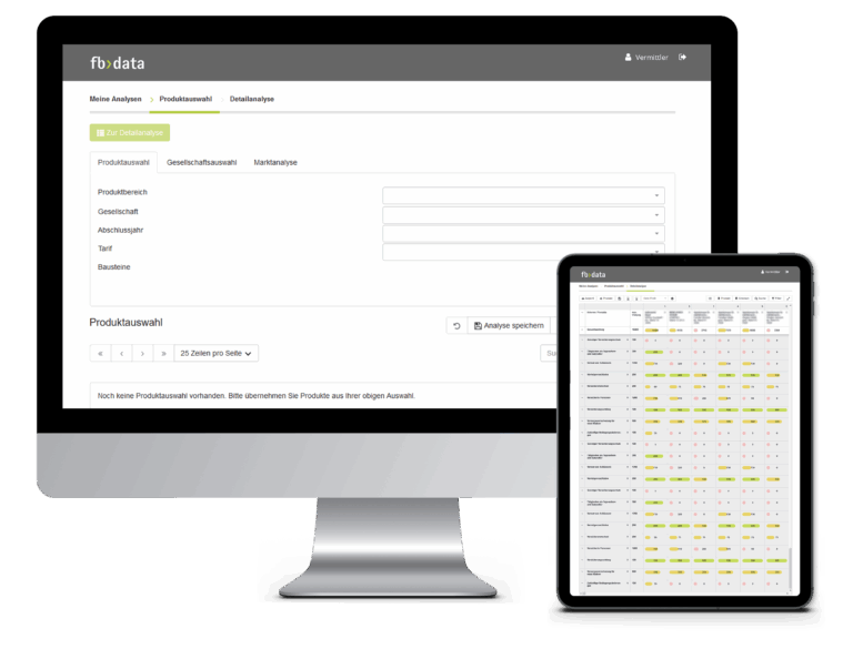 fb › data ist die professionelle Analyse- und Produktdatenbank für die Experten im Produktmanagement und in der Wettbewerbsanalyse. Mit fb › data erstellen Sie detaillierte Markt- und Wettbewerbsanalysen und aussagekräftige Benchmarkings. Legen Sie Peergroups an und recherchieren Sie alle Regelungen sofort in den originalen Bedingungstexten.